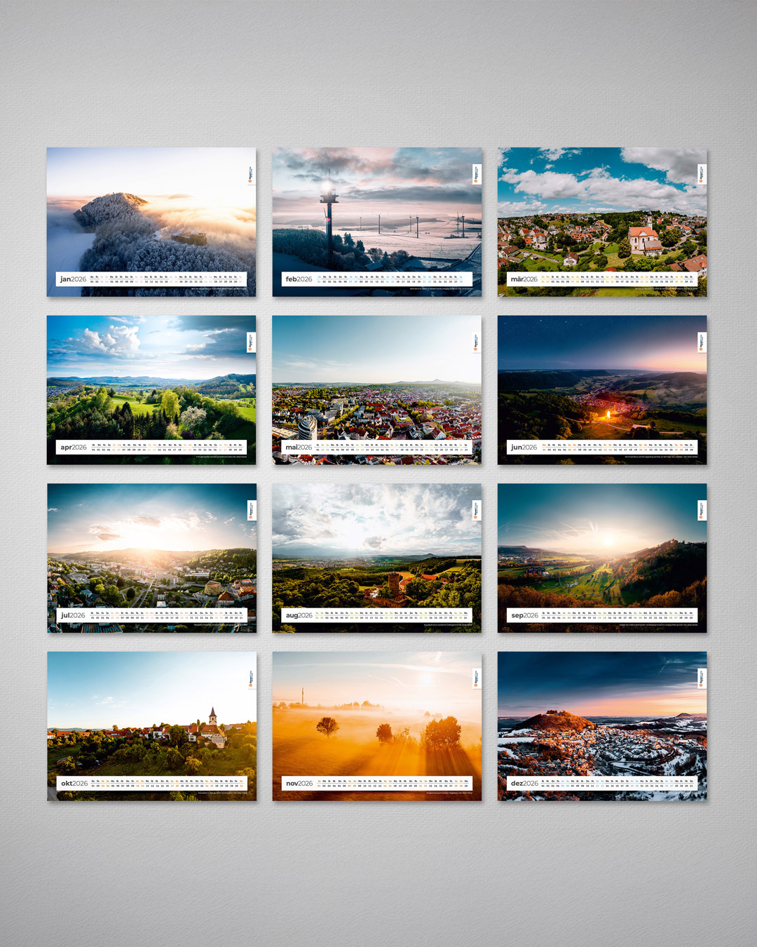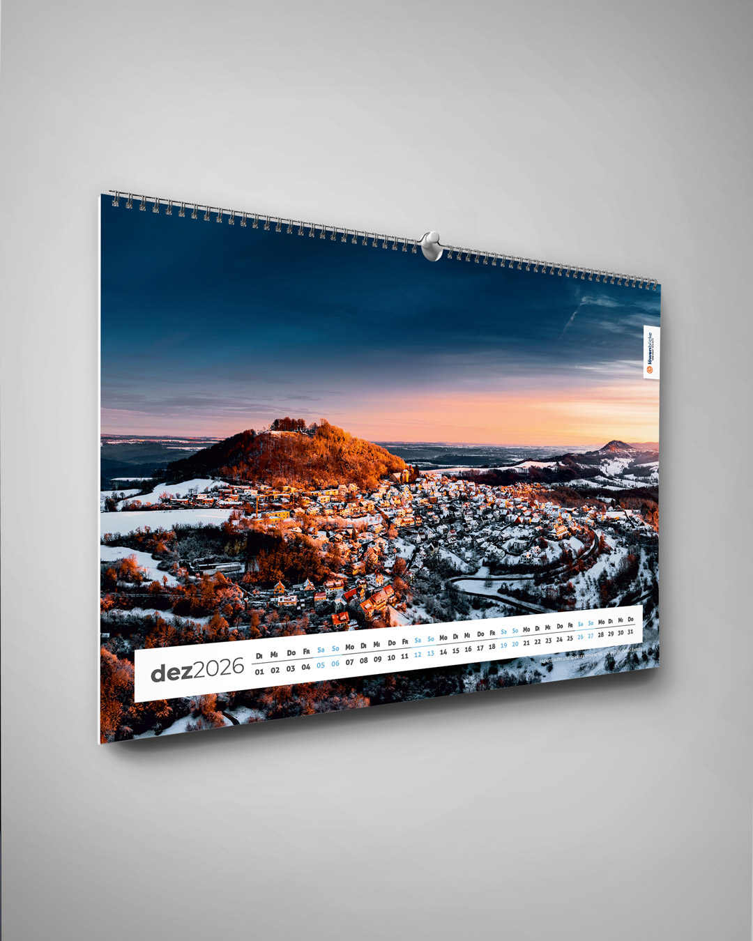 Die Kalender bestehen aus 1 Titelblatt, 12 Monatsblättern mit dem Kalendarium für das kommende Jahr und 1 Schlussblatt sowie einem grauen Rückenkarton zur Stabilität. Für den Druck verwenden wir hochwertiges mattes 250g/m² Bilderdruck Papier mit einer hohen Brillianz, am Kopf gebunden mit einer weißen Spiralbindung inklusive Aufhängemechanik. Die Produktion und Lieferungerfolgt ab Druckfreigabe innerhalb von 5-7 Werktagen.